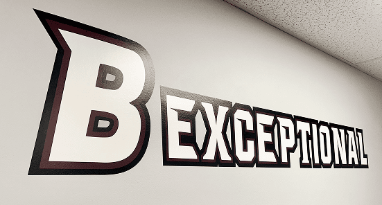 To create a cohesive look across all athletic facilities and boost team spirit, we also refreshed the area outside the athletic offices, located adjacent to the school’s second indoor gym. This phase of the project focused on clean, high-impact branding, including two large vinyl wall decals featuring the school tagline and “B” icon. These were printed on 3M IJ180cv3 with 3M 8520 Matte Laminate, resulting in a smooth finish that would also help prevent scuffs . along with a rigid PVC sign mounted above the athletic office. The result clearly identifies the athletics department while reinforcing the school’s brand and making it easy for visitors and students to find the information they need.