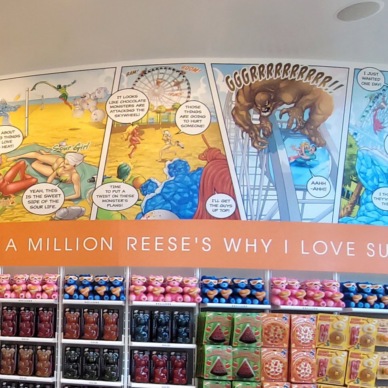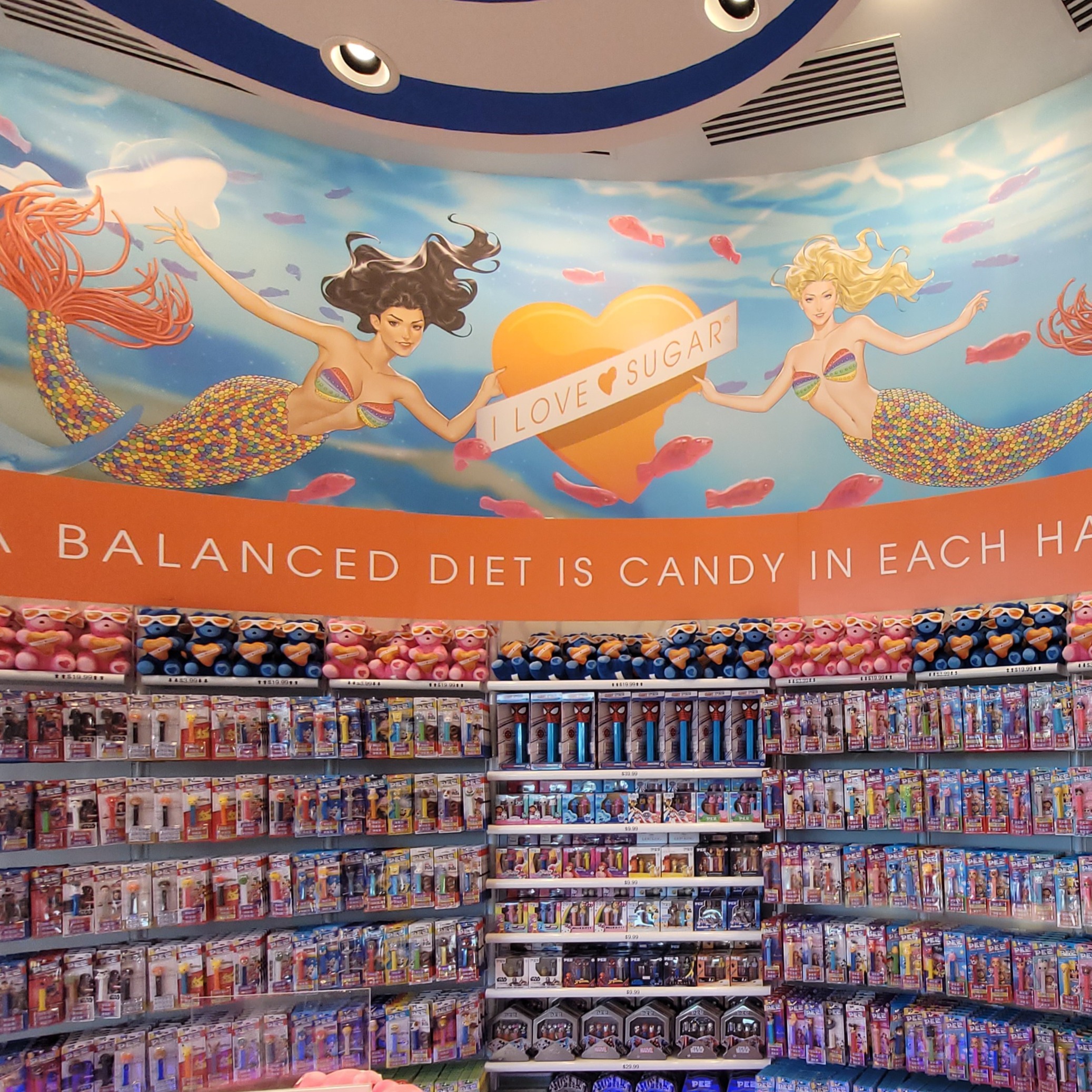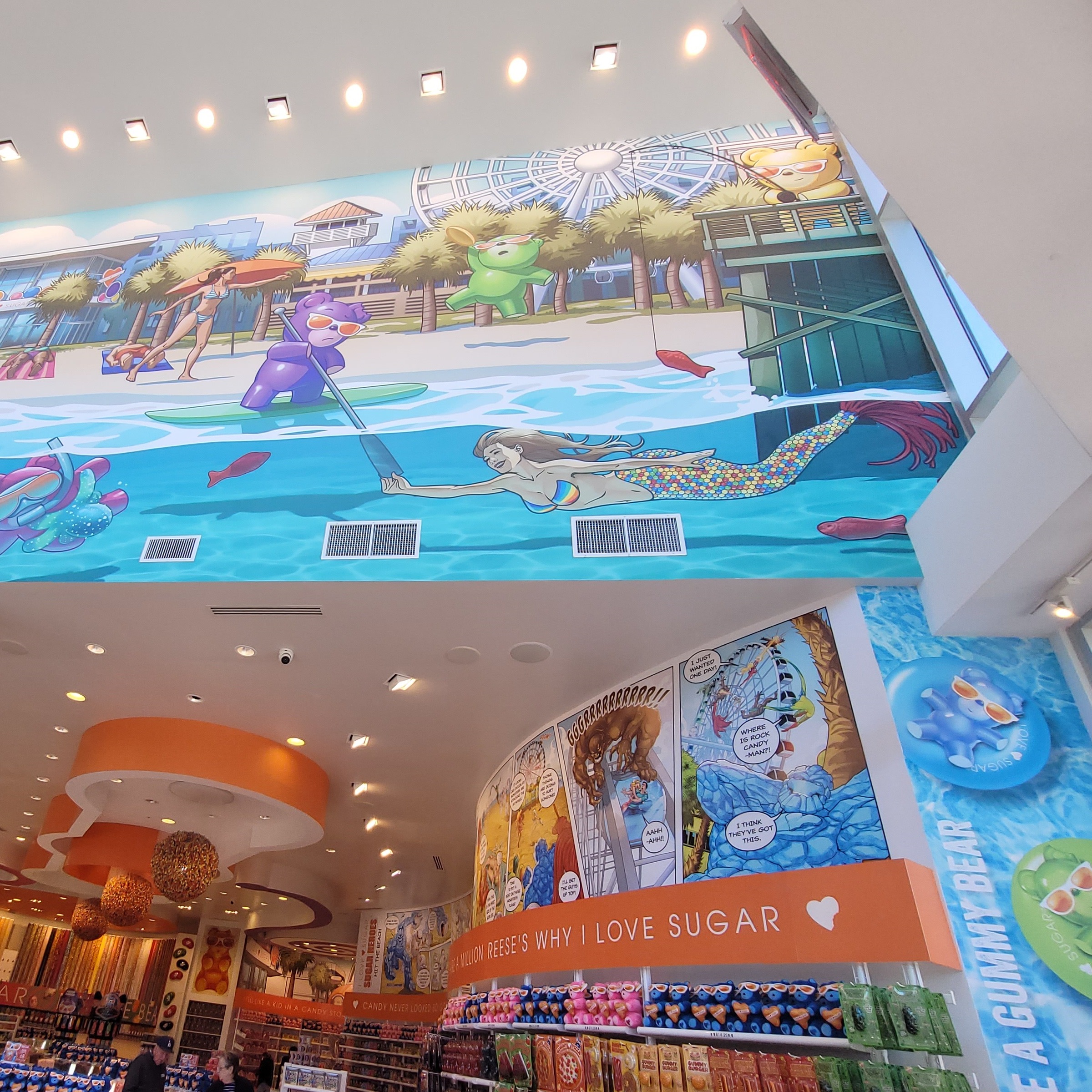 The designer of these visuals nailed the color psychology and sensory experience for shoppers of I Love Sugar. Napa of Graphic and Art Studio trusted us with printing over 300,000 square feet of wallpaper for the first location in Myrtle Beach SC.