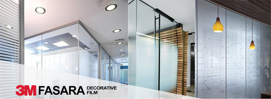Now onto the wonderful world of 3M FASARA Glass Finishes. These films are probably the easiest way to elevate any space. 0-fancy in 60 seconds. Applying the Fasara films to any smooth glass surface can turn a boring meeting room into a Japanese zen space in less than 30 minutes. They provide the perfect blend of privacy and design. Plus the films are easier and less expensive than custom etched glass!