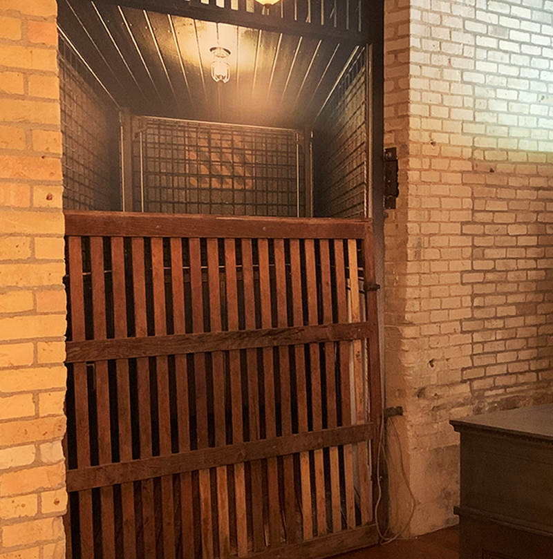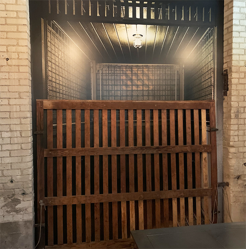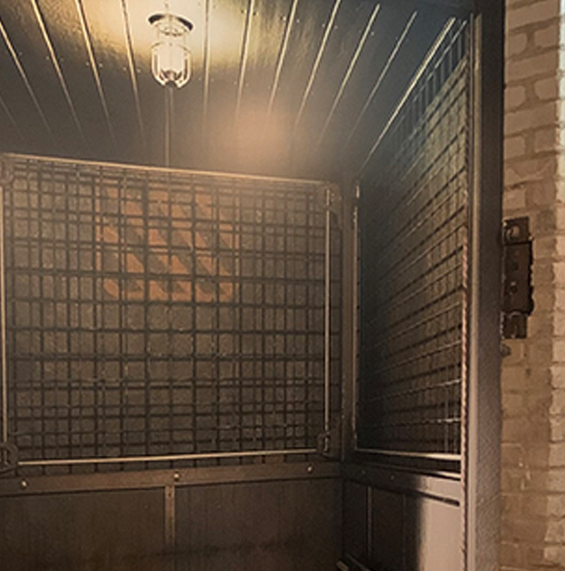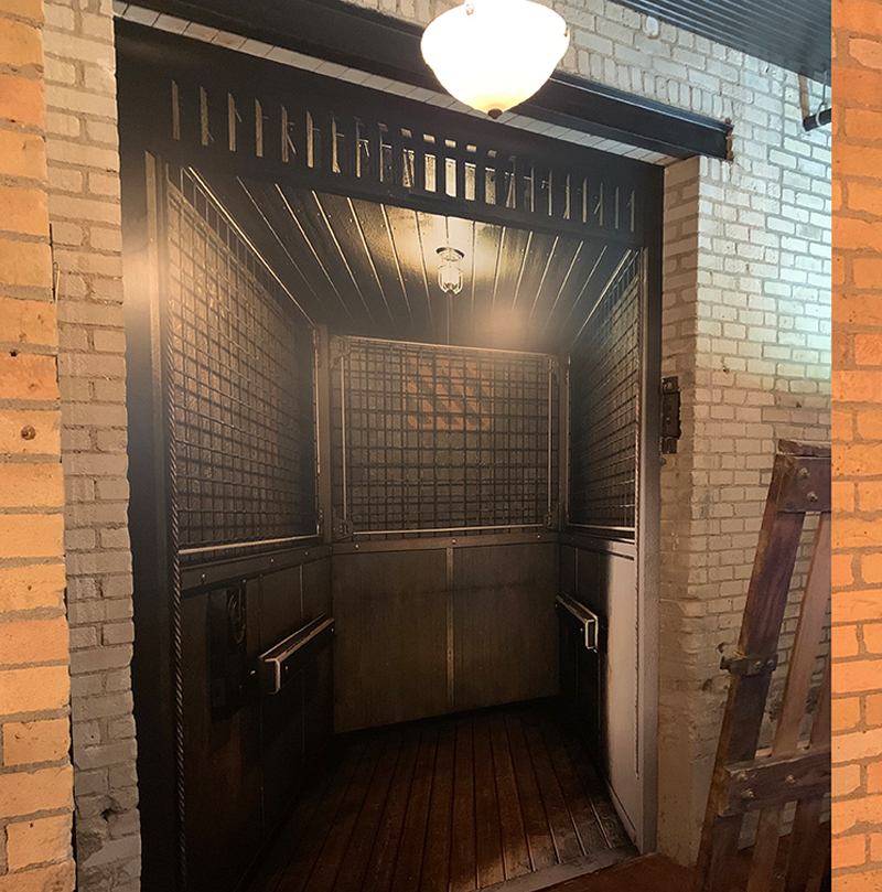 During the rebuild process of this stately old building, an old freight elevator had to be closed off. Our customer created a wall mural that looks like an old freight elevator to make it look as if it was still there.